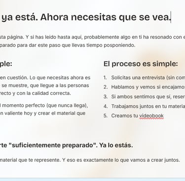 Resultado final: Un videobook con ritmo, presencia y calidad visual de nivel cinematográfico que te posiciona inmediatamente como un profesional serio y preparado.