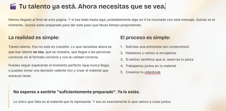 Tienes un videobook, pero cuando lo ves, no te reconoces. No transmite tu esencia, tu energía ni tu verdadero potencial interpretativo.