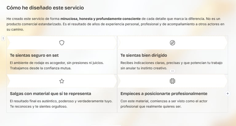 Este no es simplemente un "te grabo unas escenas y ya está". Es un servicio integral y profesionalmente dirigido diseñado específicamente para que salgas del proceso con material audiovisual que realmente te represente, te potencie y abra puertas en tu carrera actoral.